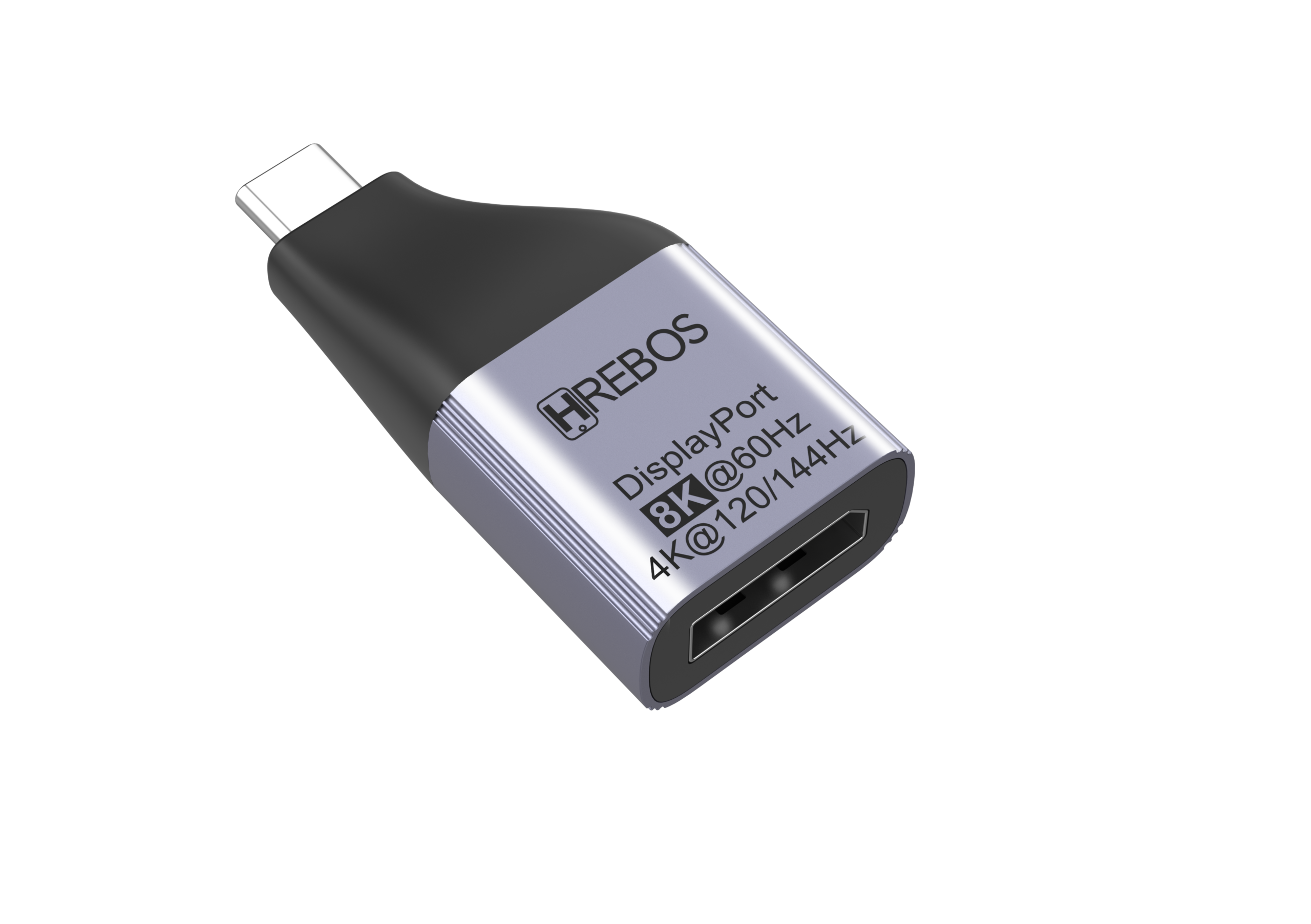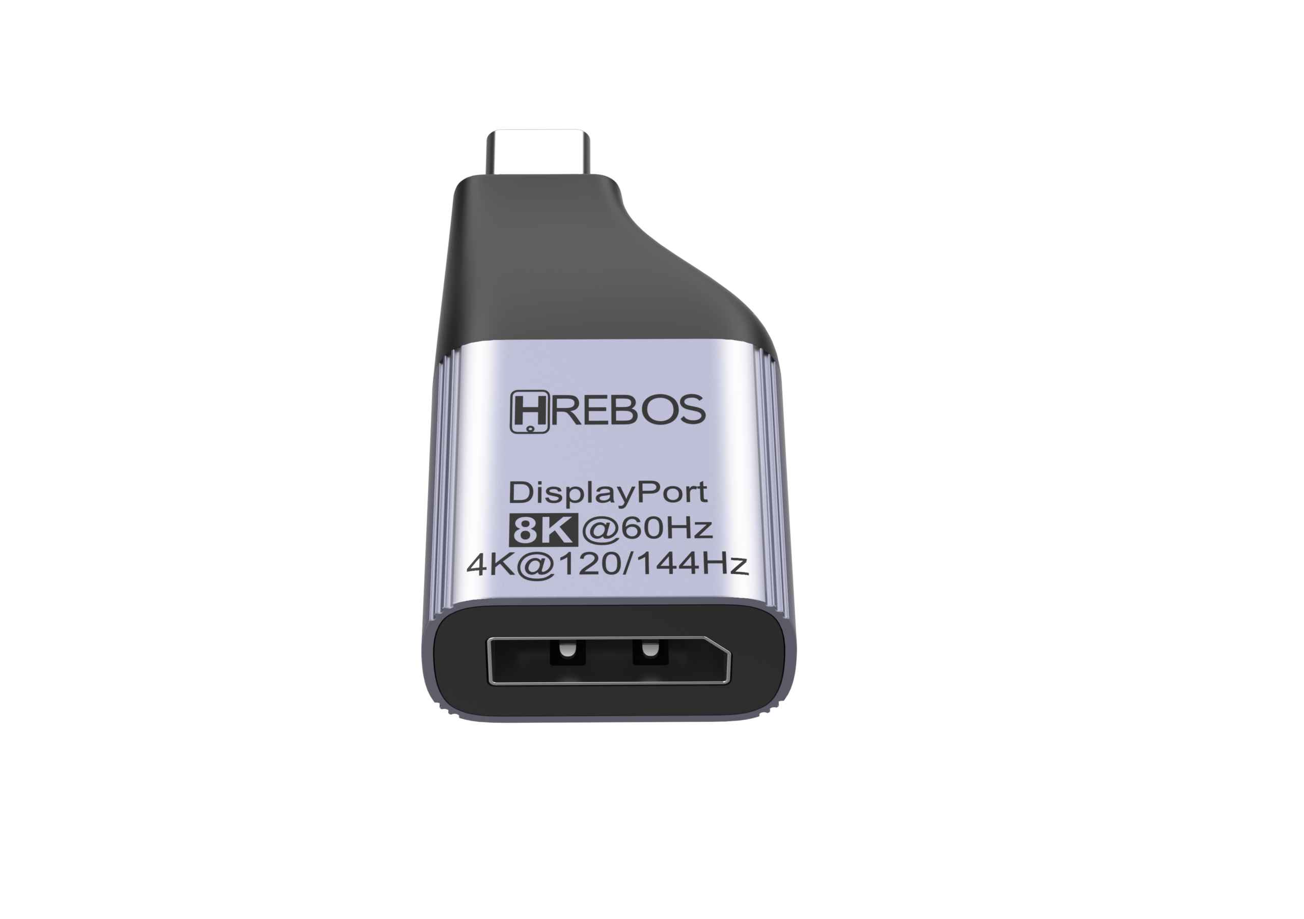 Adaptador Hrebos USB-C para DisplayPort com suporte a 8K@60Hz e 4K até 144Hz, compacto e ideal para monitores.