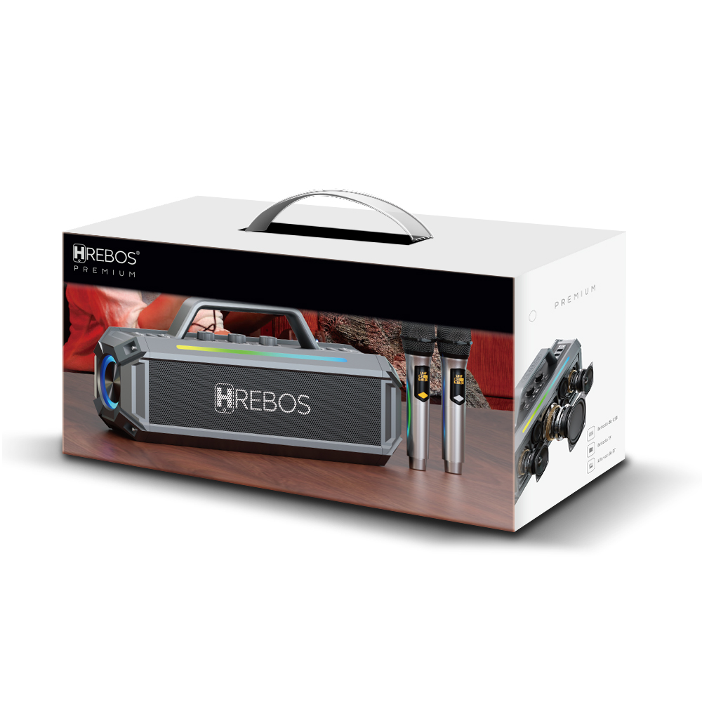 Caixa de som Hrebos CS-901 Bluetooth 300W com alça e 2 microfones, feita pra festa, karaokê e eventos.