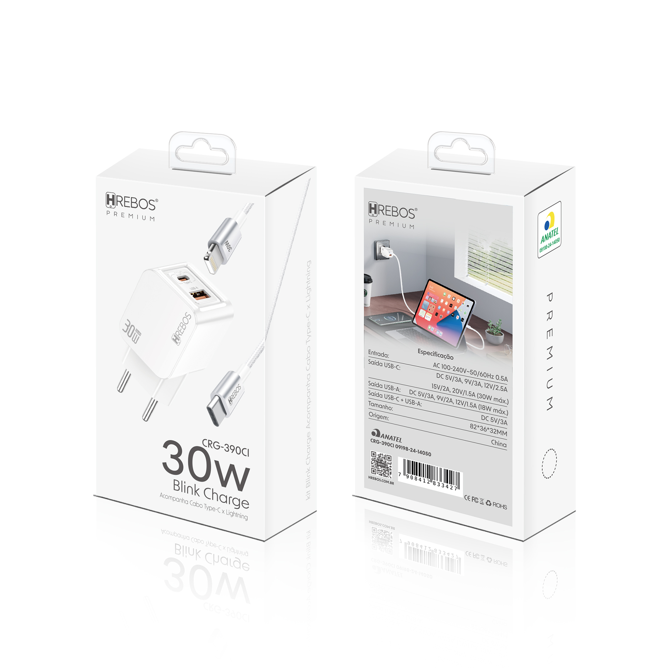 - CRG-390CI: carregador 30W + cabo Type-C x Lightning