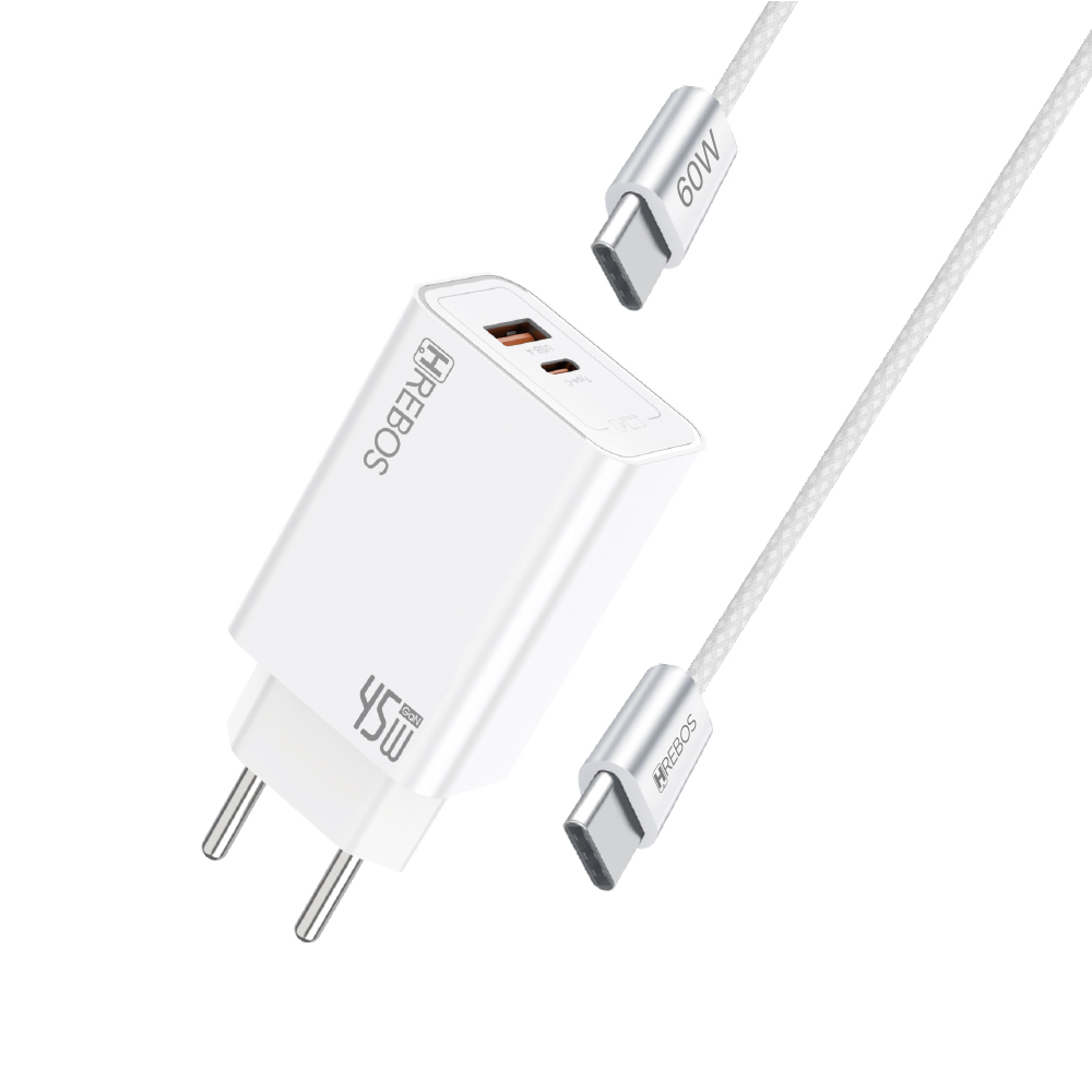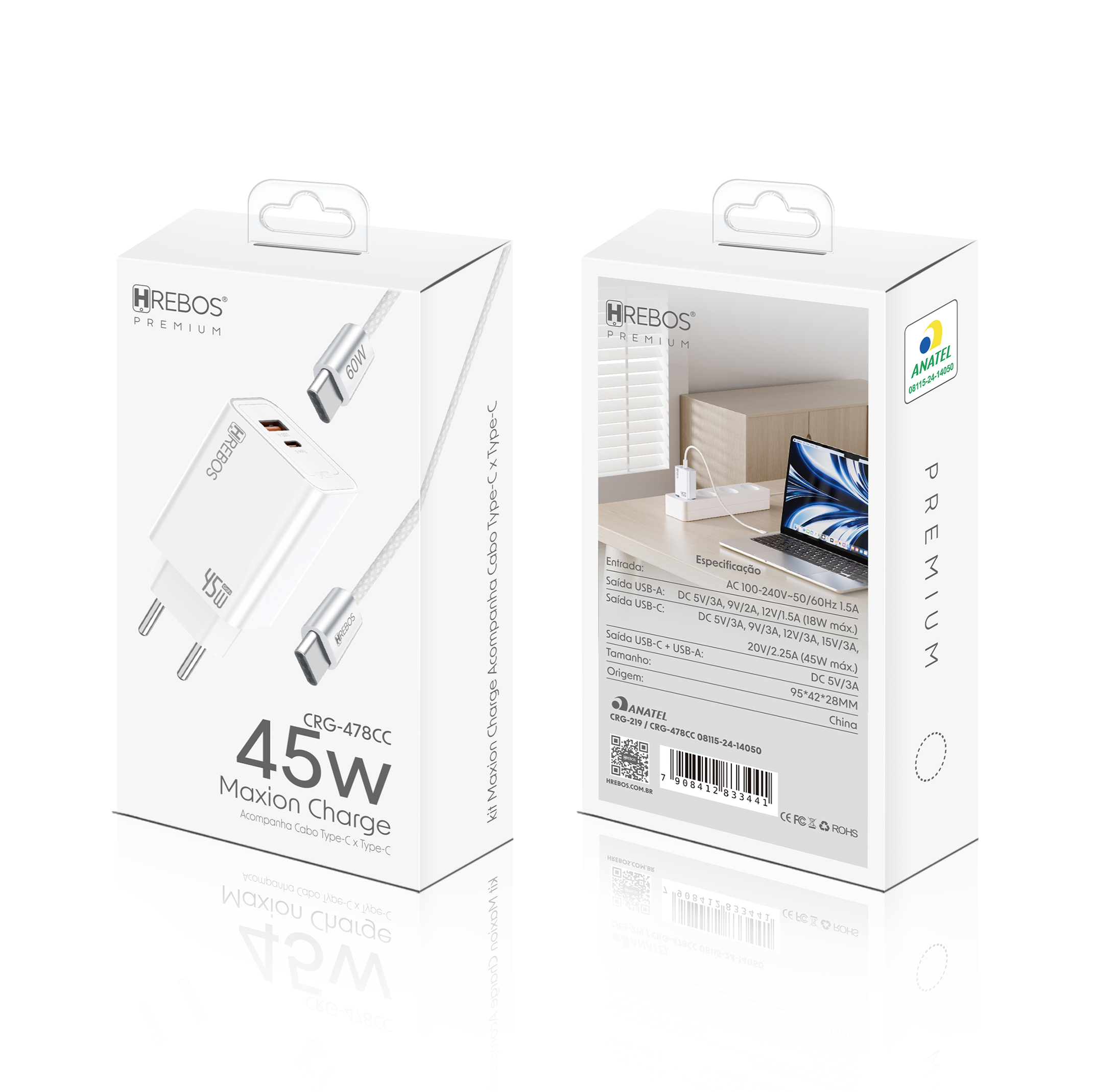 - CRG-478CC: carregador 45W + cabo Type-C × Type-C (60W);