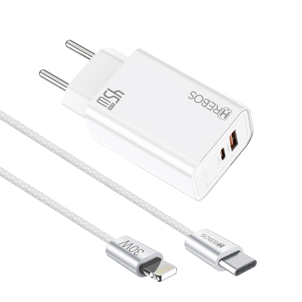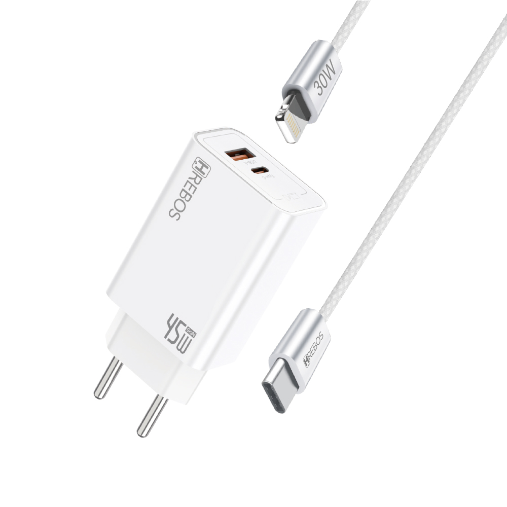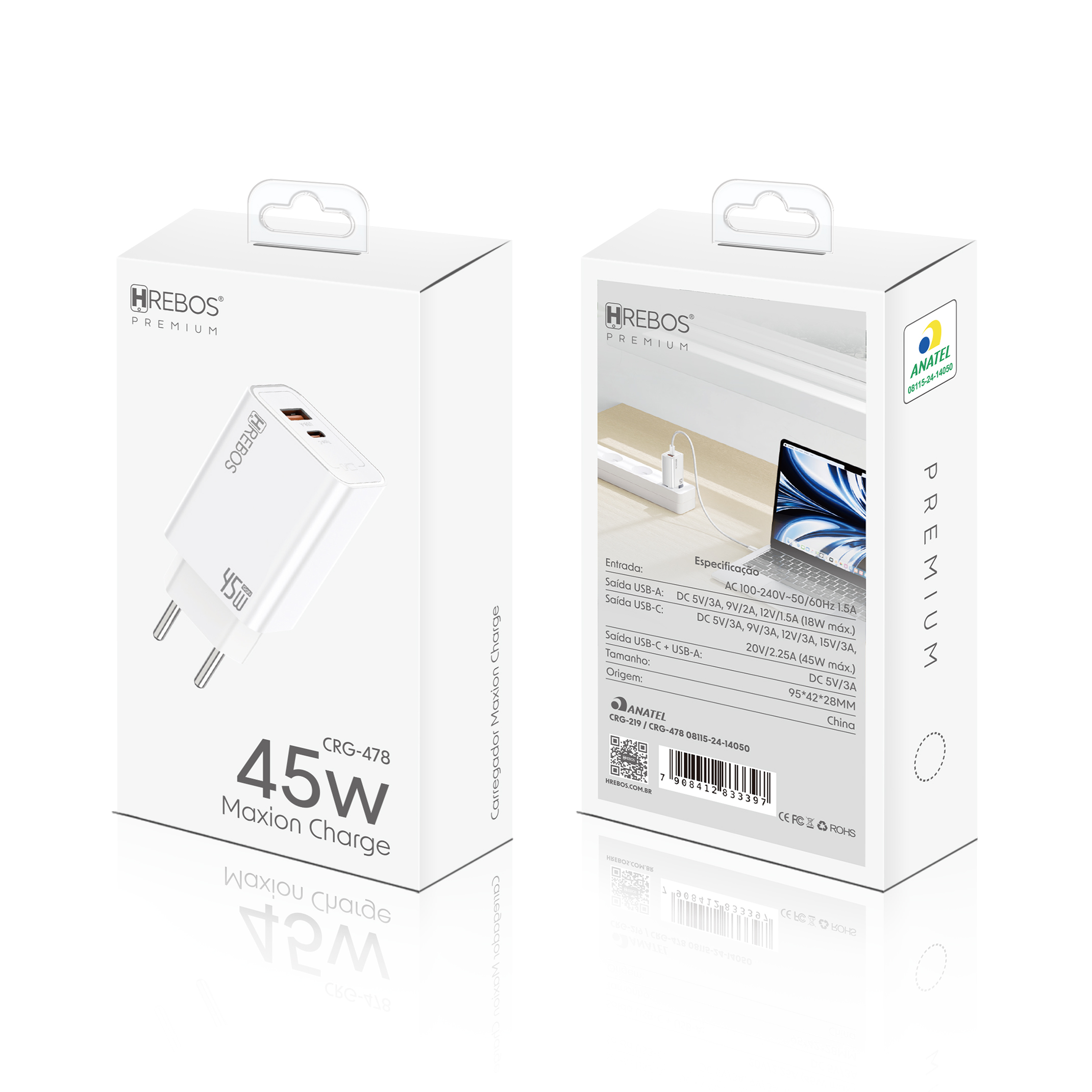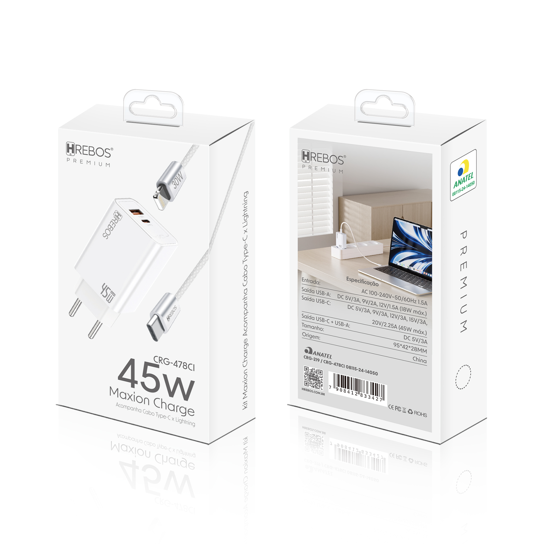 - CRG-478CI: carregador 45W + cabo Type-C × Lightning (30W).